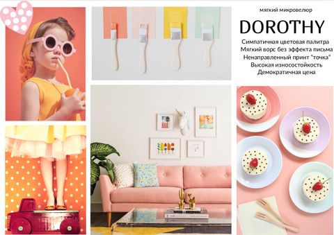 Так же, как и маленькая девочка из той самой сказки наша Dorothy мягкая, нежная на ощупь, со средней длины ворсом без эффекта памяти, при этом она стойкая к различным загрязнениям и повреждениям. Своим внешним видом она порадует детей и взрослых, станет отличным дополнением к любому интерьеру и форме мебели. Вот только наша Dorothy еще и яркая, задорная малышка с легким ненаправленным дизайном «точка» и сочной палитрой цветов из тех самых золотых 50х.