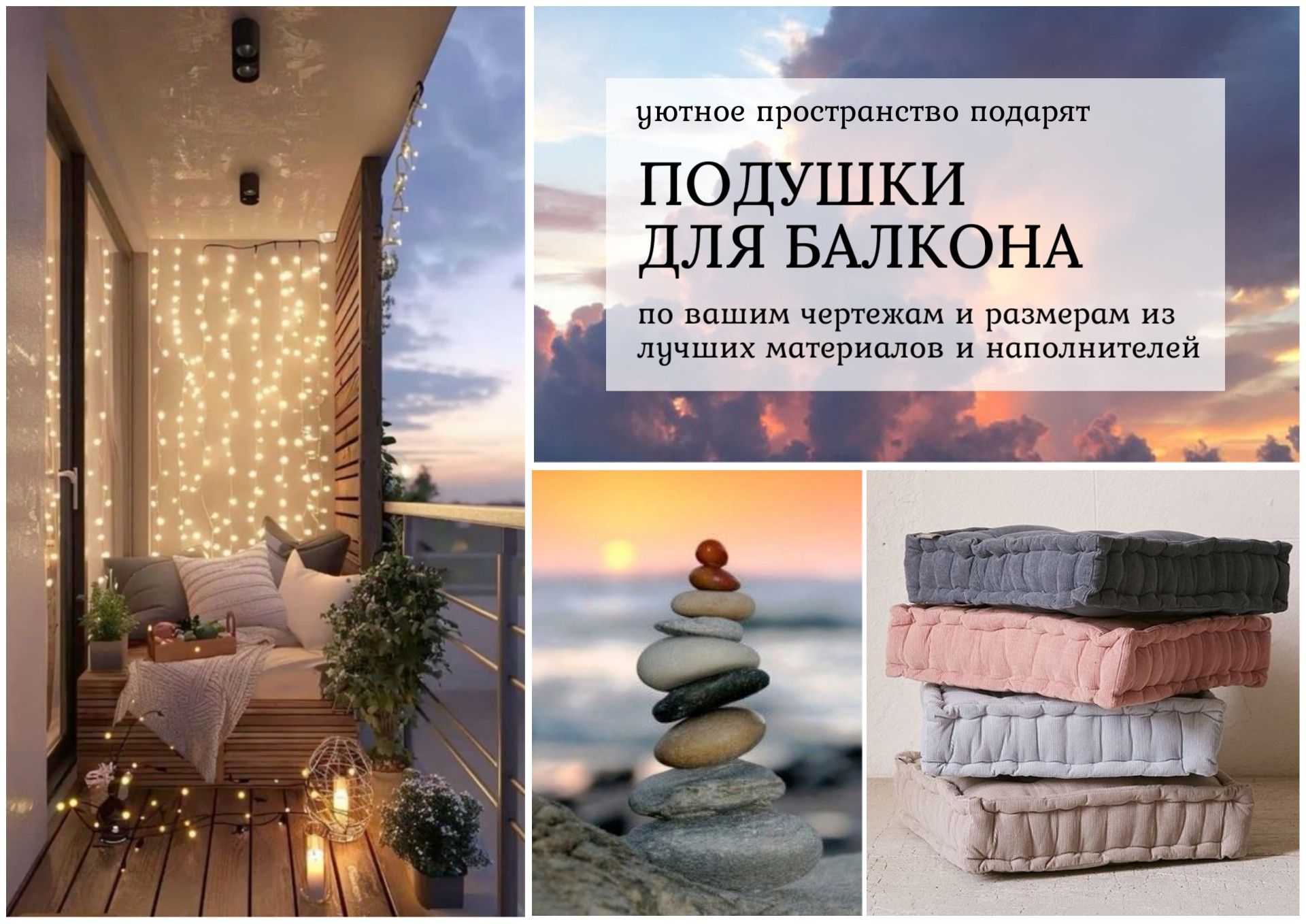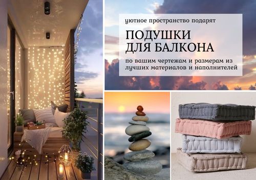 Мы поможем подобрать материалы, наполнители, виды креплений и застежек, а также можем организовать собственно и сам пошив подушек по вашим размерам или по нашим стандартным лекалам. Просто позвоните нам и начните свой путь к красивому и удобному балкону, на котором так приятно провести время.