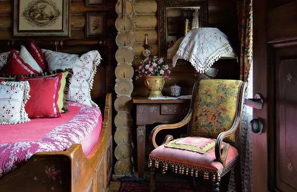 Следующее направление – русская изба и его разновидность – русский терем. И снова обратимся к Пушкину. Тут как в «Сказке о рыбаке и рыбке» изба целенаправленно превращается в терем. При этом меняется лишь количество ярусов и слуг, а основное убранство остается примерно схожим – деревянные полы, бревенчатые стены, сводчатые потолки, небольшие фигурные окна со ставнями и наличниками, ковры на стенах и мебели, простые деревянные столы и стулья, сундуки, и печь как неотъемлемый центр помещения. Все это так или иначе олицетворяет стиль убранства древней и средневековой Руси. Этот тип интерьера считается экологичным, так как использует максимально природные материалы, натуральные фактуры и приглушенные краски с яркими акцентами. Куда же без них в русском тереме?